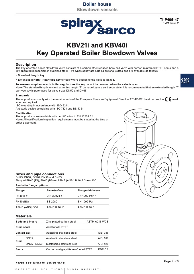 The key operated boiler blowdown valve consists of a carbon steel reduced bore ball valve with carbon reinforced PTFE seats and a