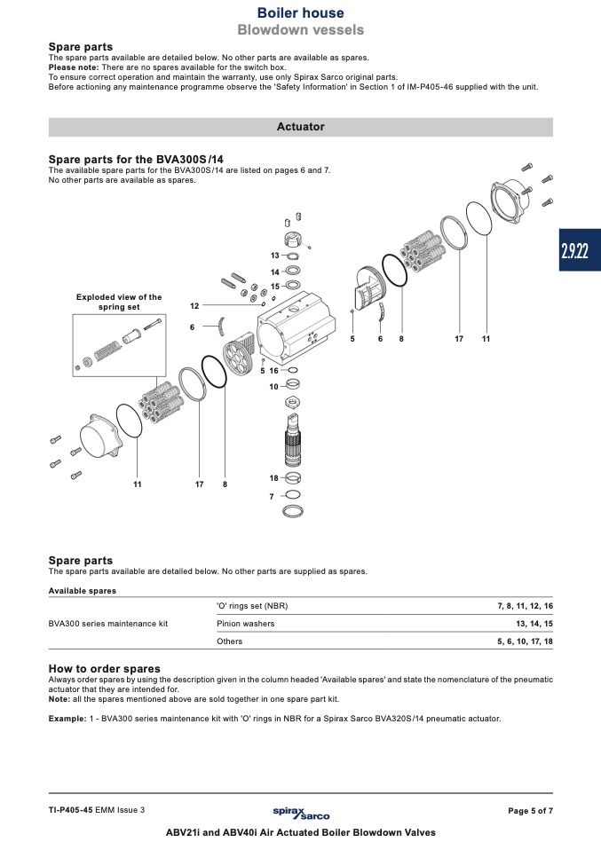 Example: 1 - BVA300 series maintenance kit with 'O' rings in NBR for a Spirax Sarco BVA320S/14 pneumatic actuator.