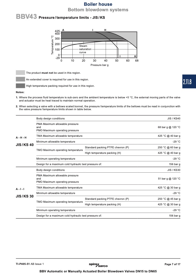 the valve pressure / temperature limits shown in table below.