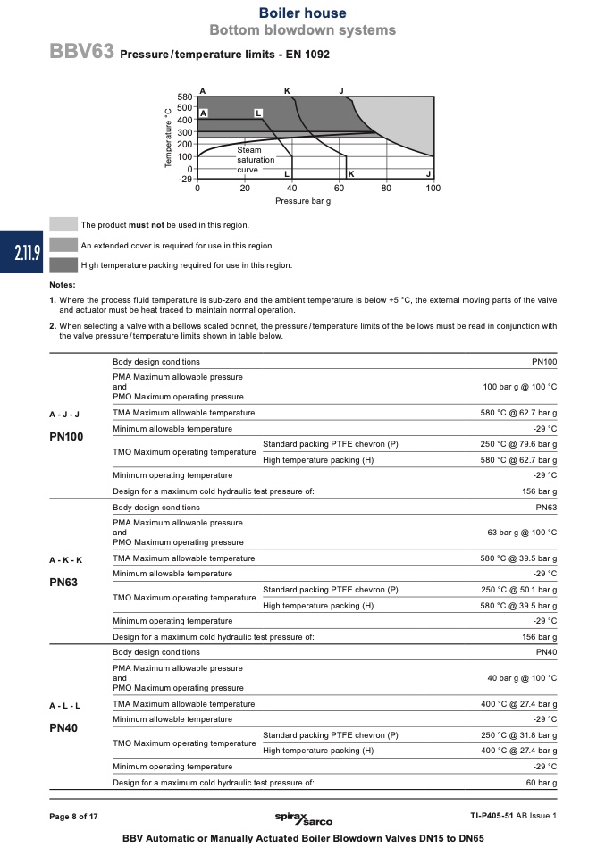 the valve pressure / temperature limits shown in table below.