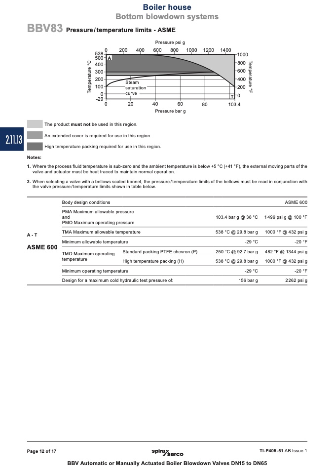 the valve pressure / temperature limits shown in table below.