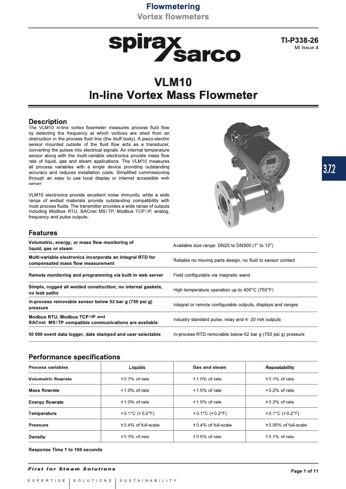 The VLM10 in-line vortex flowmeter measures process fluid flow