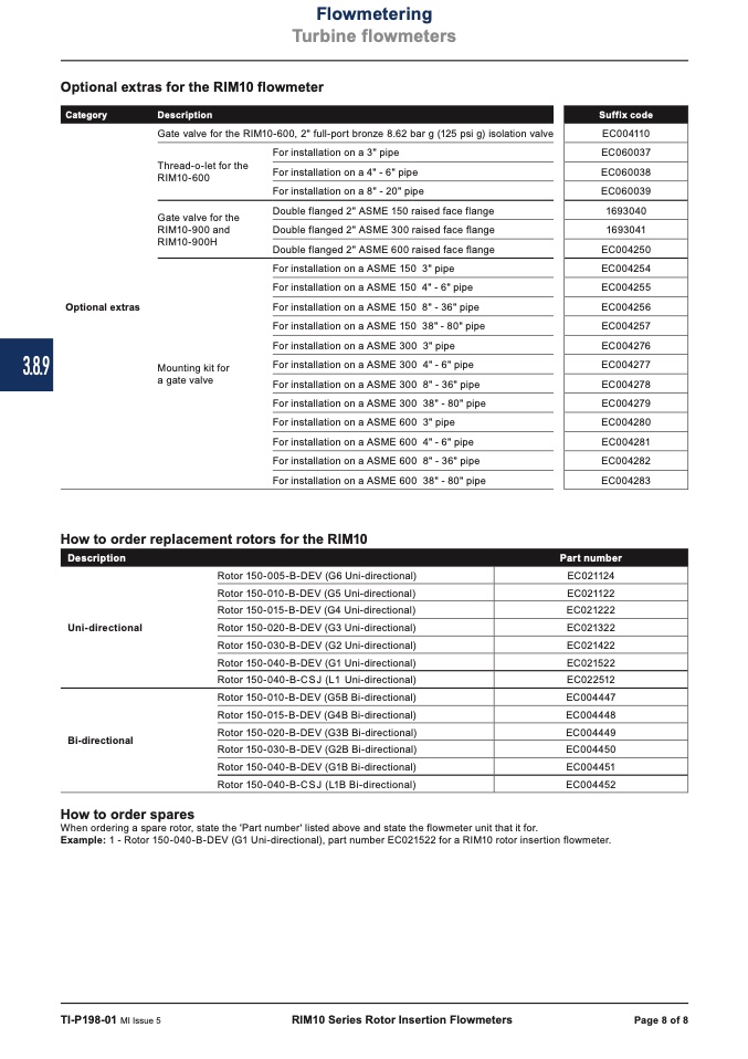 Example: 1 - Rotor 150-040-B-DEV (G1 Uni-directional), part number EC021522 for a RIM10 rotor insertion flowmeter.