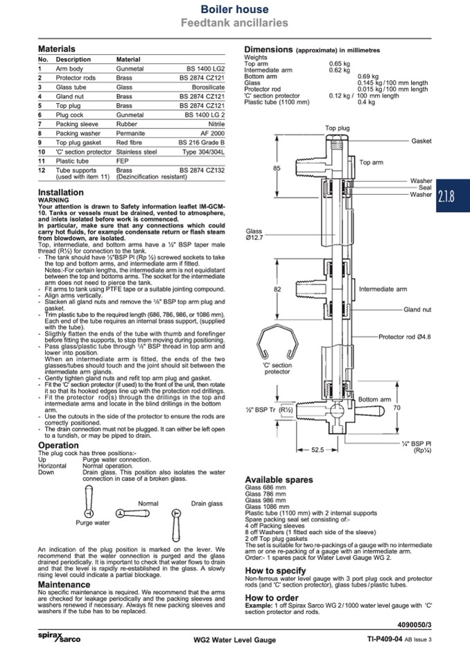 Example: 1 off Spirax Sarco WG 2 / 1000 water level gauge with 'C'