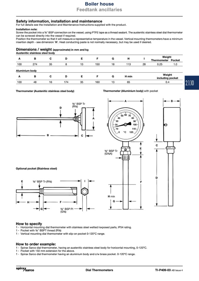 Screw the pocket into a 1⁄2" BSP connection on the vessel, using PTFE tape as a thread sealant. The austenitic stainless steel dial thermometer