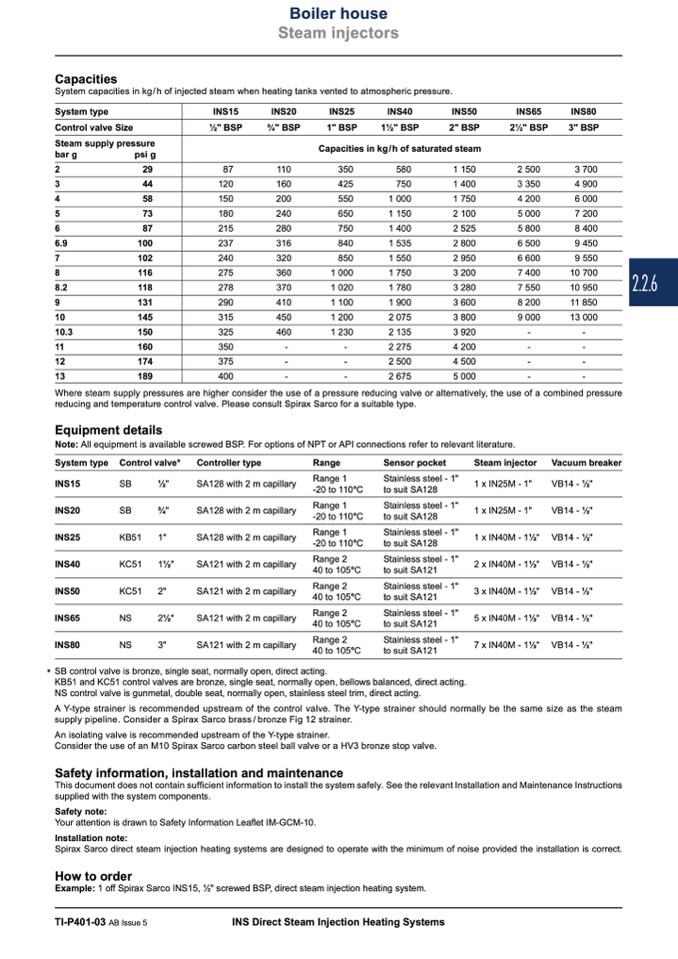 Example: 1 off Spirax Sarco INS15, 1⁄2" screwed BSP, direct steam injection heating system.