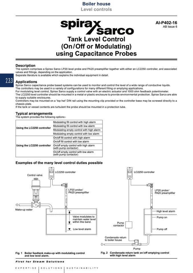 The system comprises a Spirax Sarco LP20 level probe and PA20 preamplifier together with either an LC2250 controller, and associated