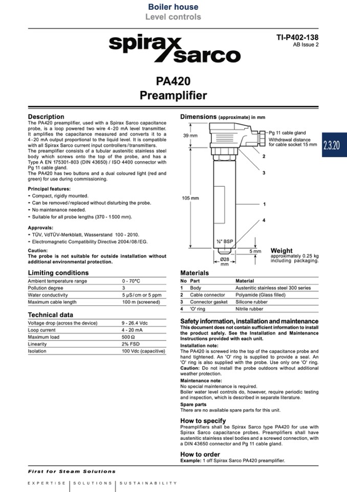 The PA420 preamplifier, used with a Spirax Sarco capacitance