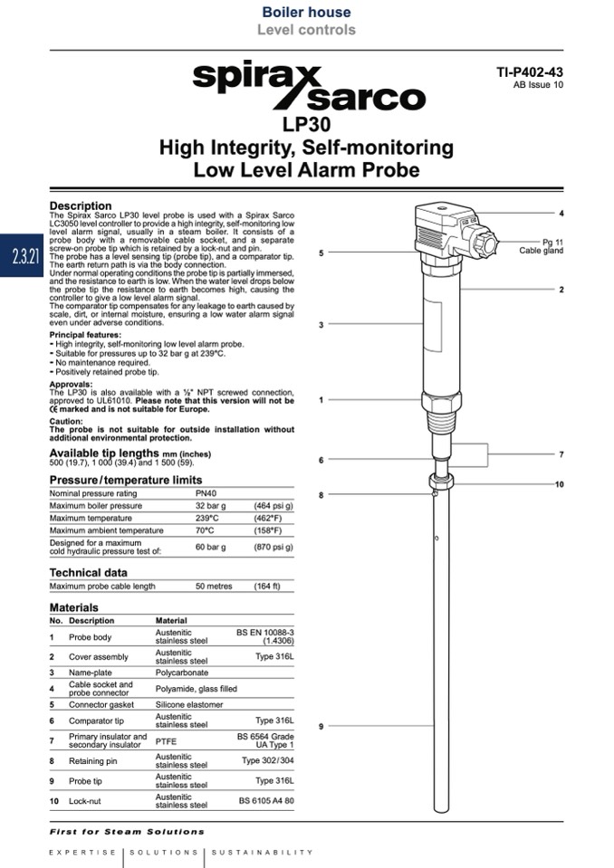 The Spirax Sarco LP30 level probe is used with a Spirax Sarco