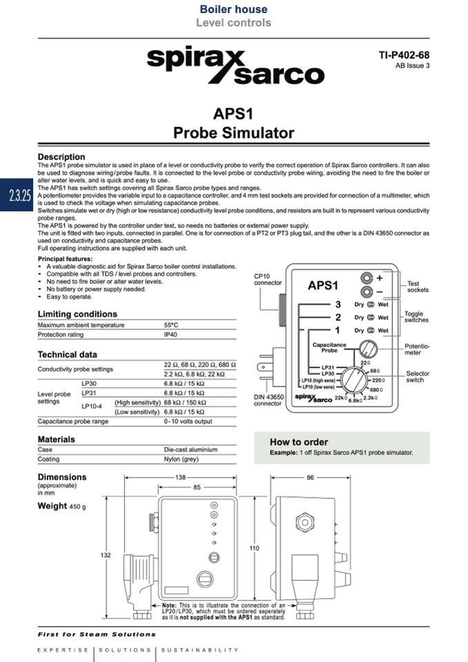 The APS1 probe simulator is used in place of a level or conductivity probe to verify the correct operation of Spirax Sarco controllers. It can also
