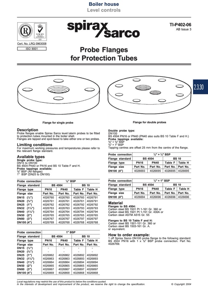 1 off Spirax Sarco DN100 probe flange to the following standard: