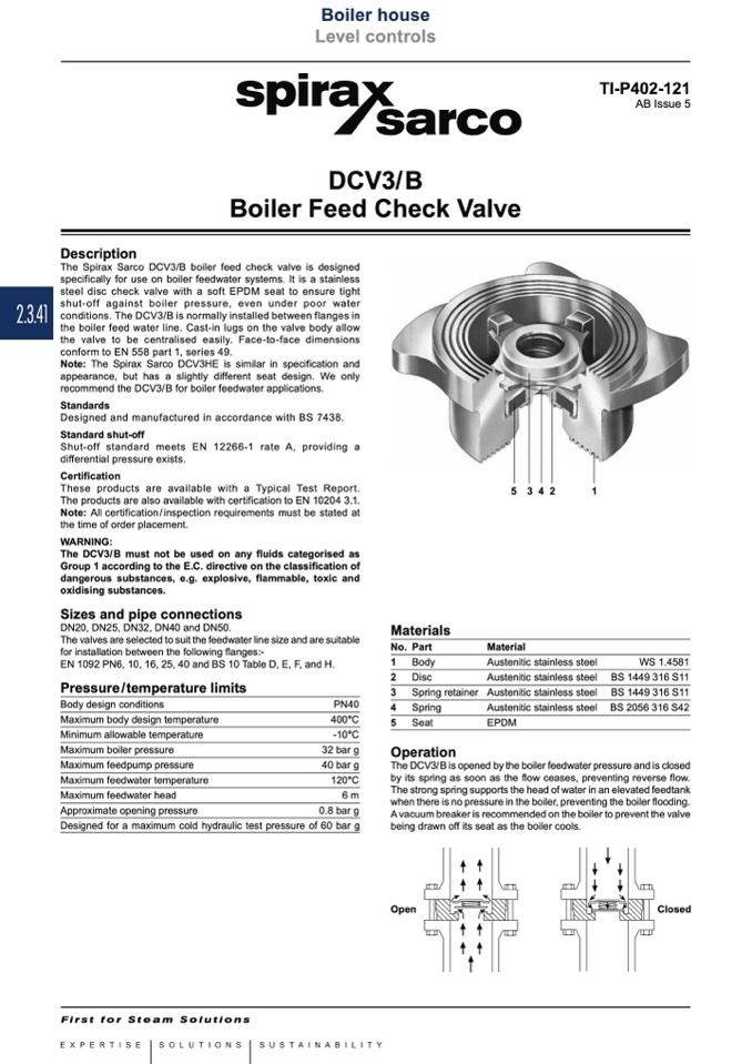 The Spirax Sarco DCV3/B boiler feed check valve is designed