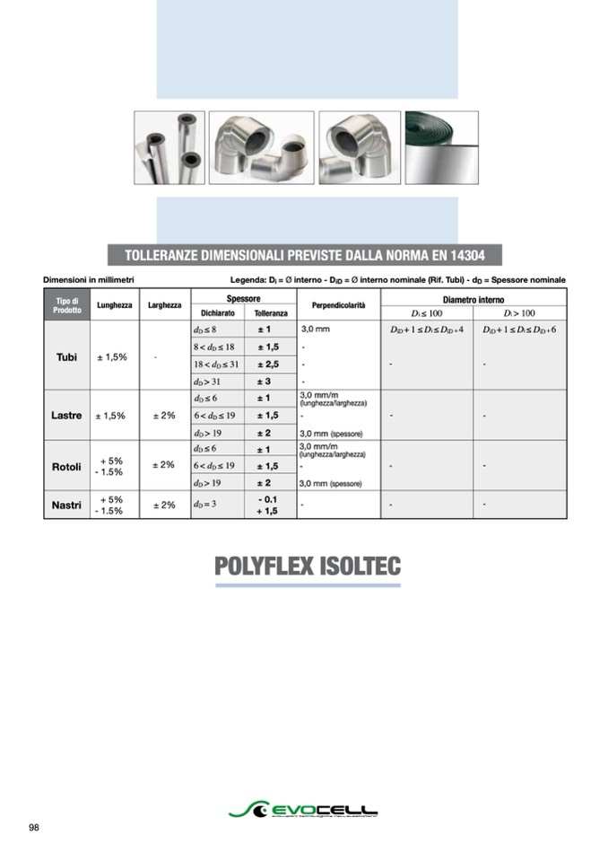 Legenda: Di = Ø interno - DiD = Ø interno nominale (Rif. Tubi) - dD = Spessore nominale