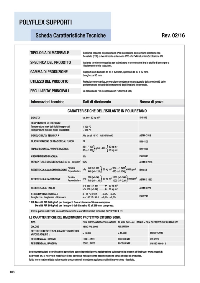 * NB: Densità PIR 60 kg/m3 per i supporti fino al diametro 35 mm compreso.