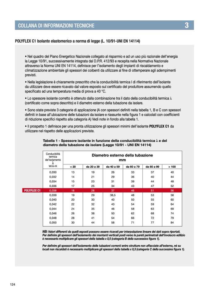 • Il prospetto 1 definisce per una pronta utilizzazione gli spessori minimi dell’isolante POLYFLEX C1 da