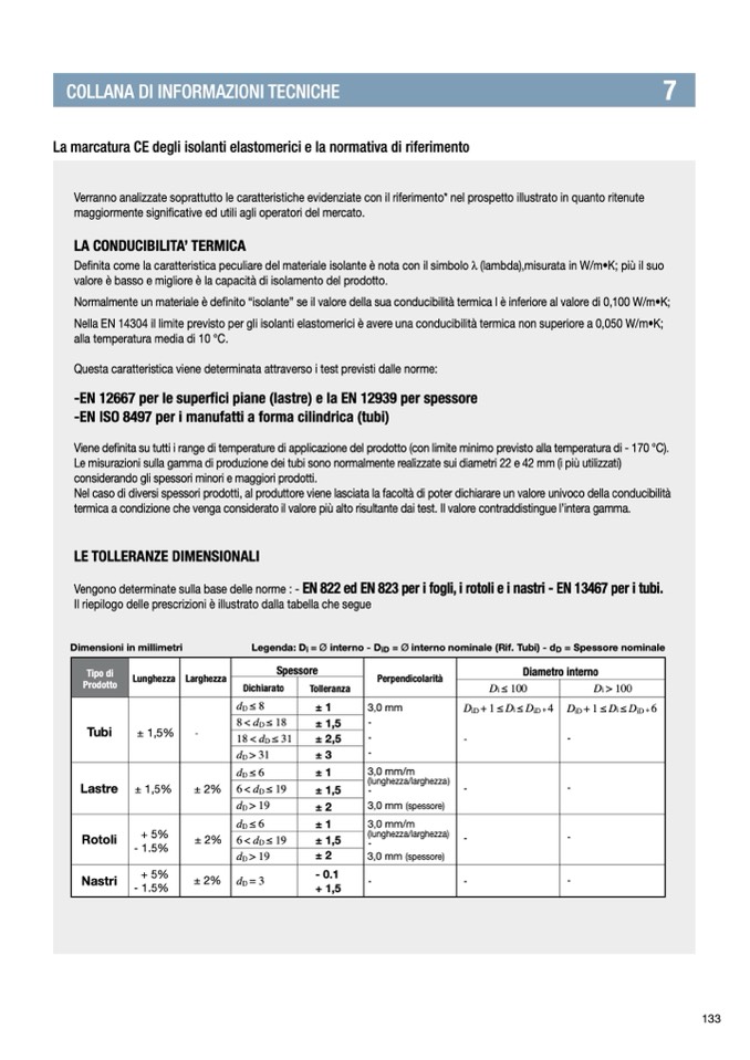 Nella EN 14304 il limite previsto per gli isolanti elastomerici è avere una conducibilità termica non superiore a 0,050 W/m•K;