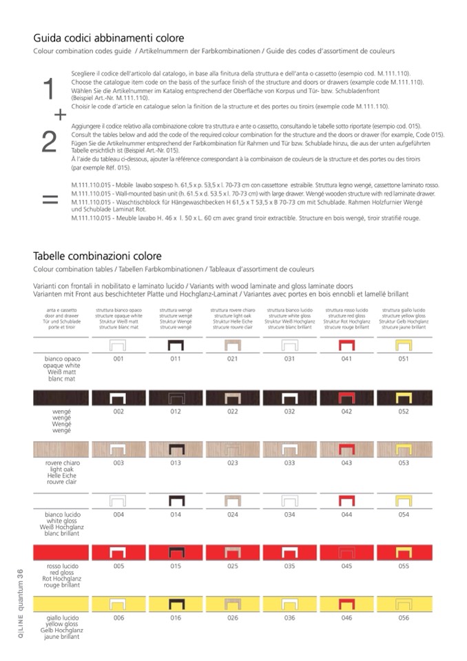 Aggiungere il codice relativo alla combinazione colore tra struttura e ante o cassetto, consultando le tabelle sotto riportate (esempio cod. 015).