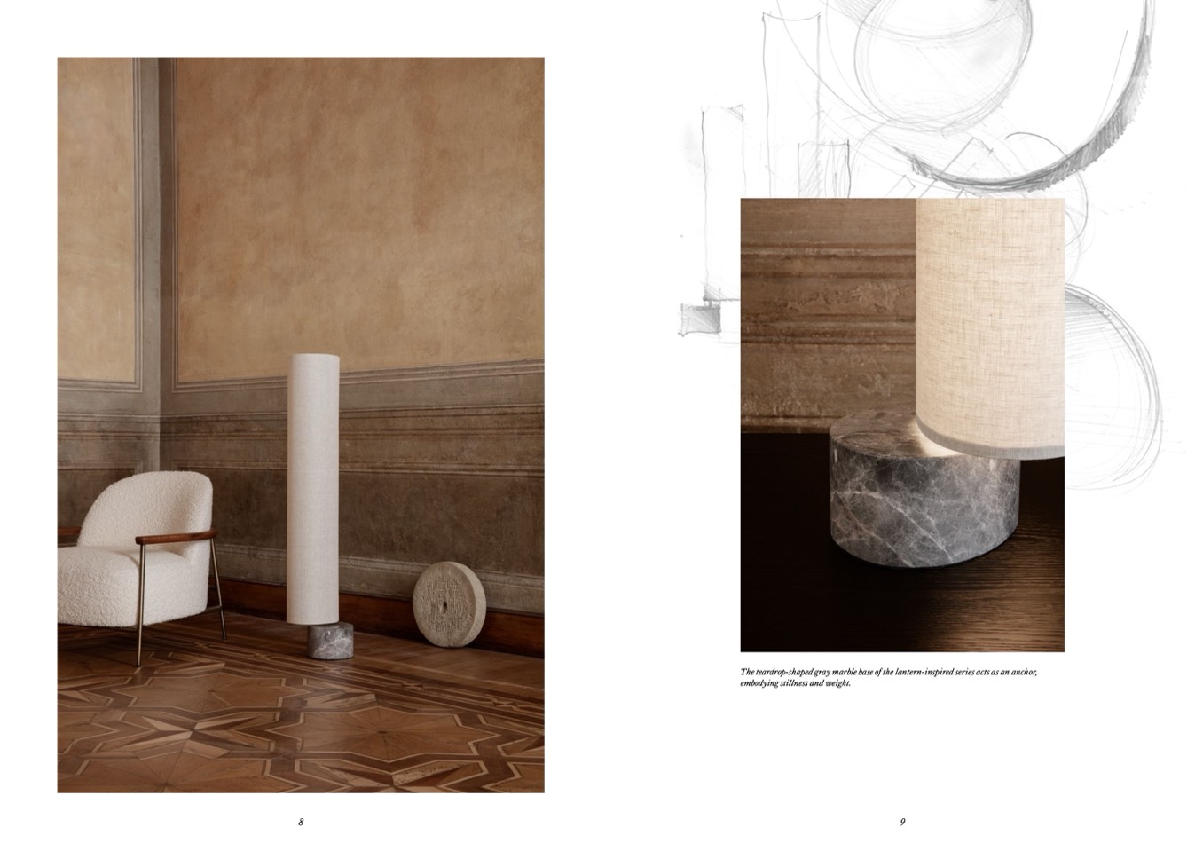 The teardrop-shaped gray marble base of the lantern-inspired series acts as an anchor,
