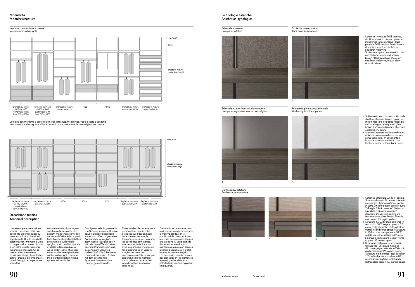 Version with wall uprights and back panels in fabric, melamine, lacquered glass and mirror