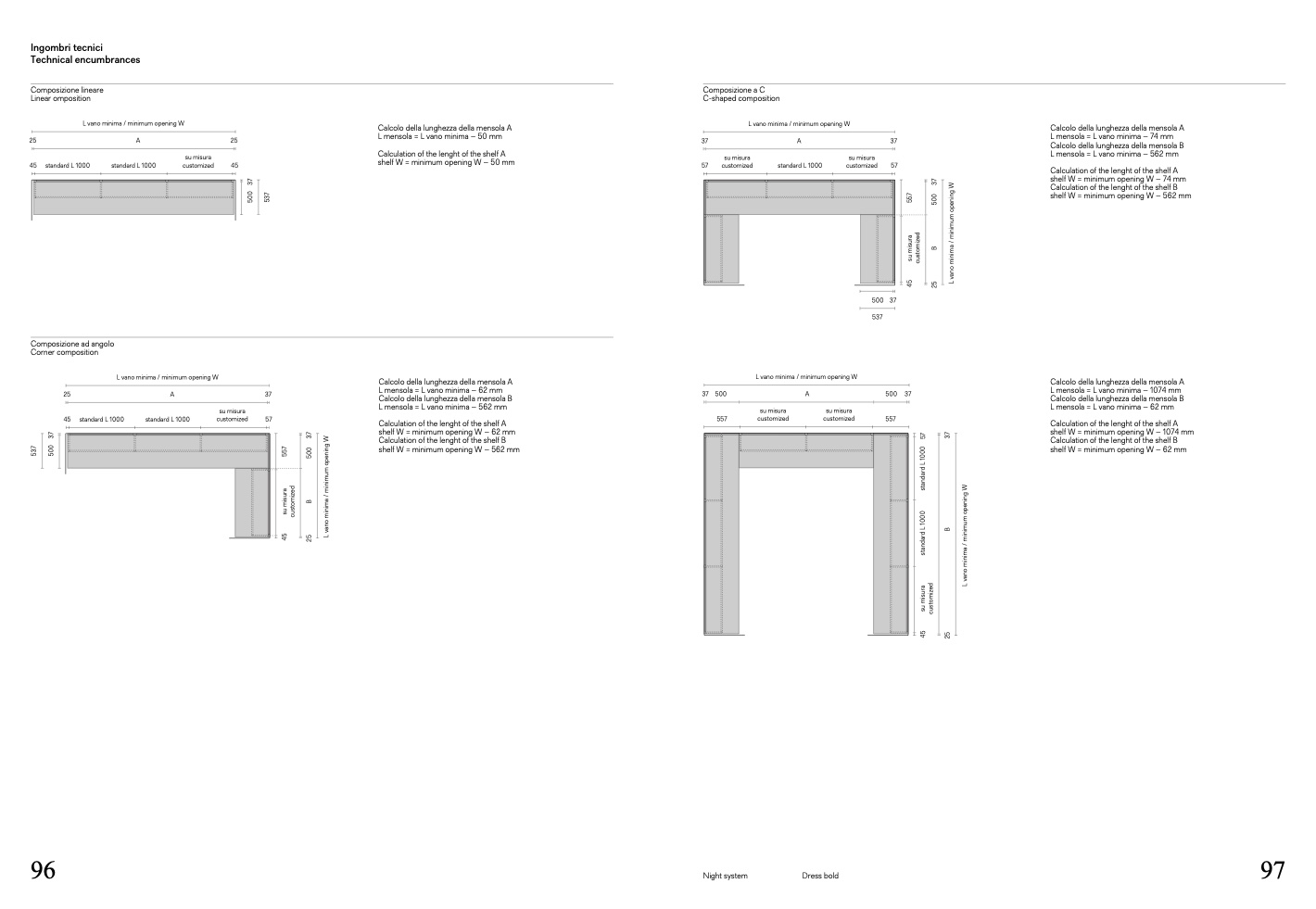 shelf W = minimum opening W – 1074 mm