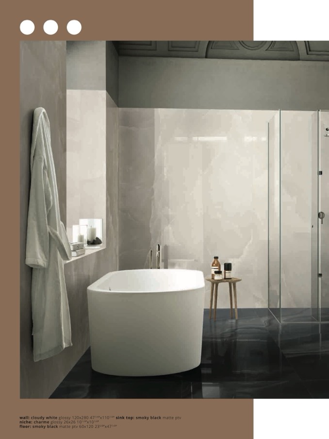wall: cloudy white glossy 120x280 471/4”x1101/4” sink top: smoky black matte pt