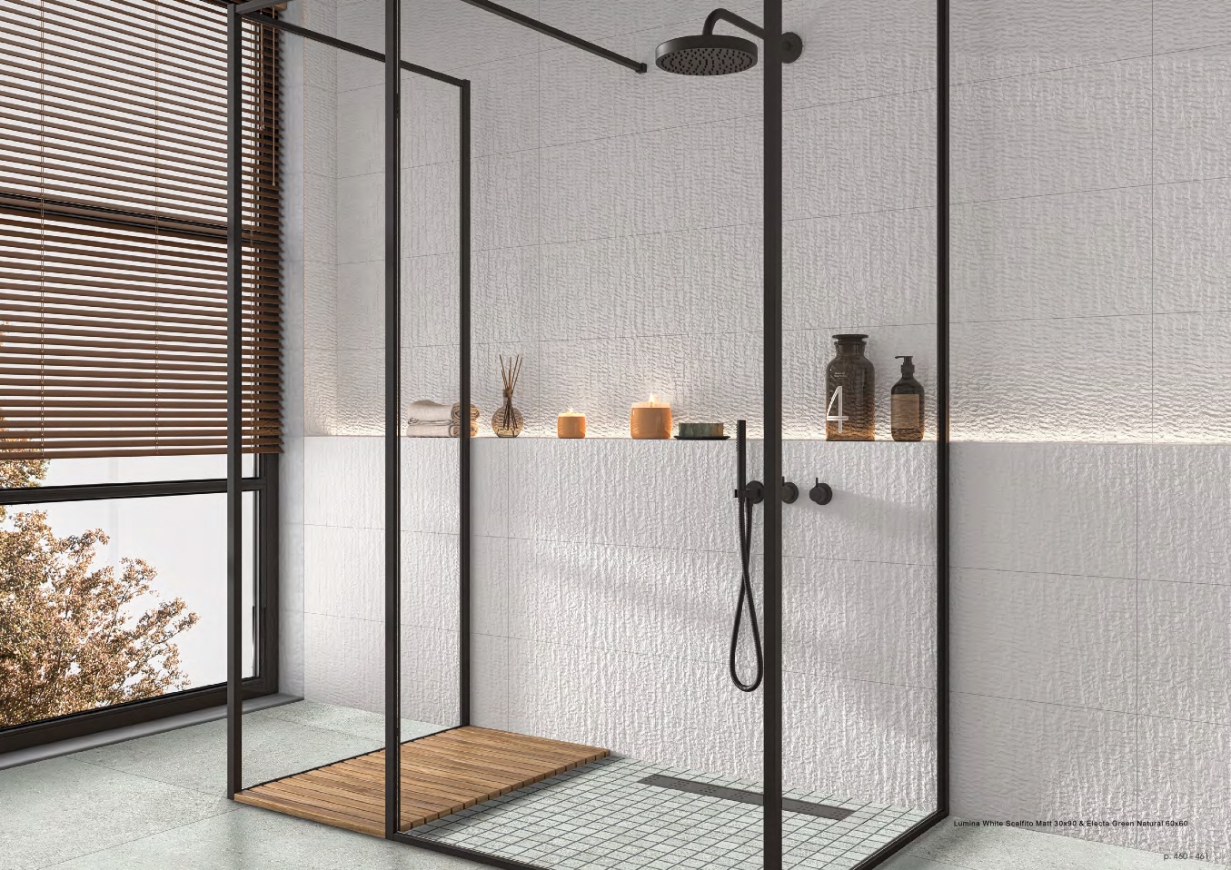 Lumina White Scalfito Matt 30x90 & Electa Green Natural 60x60