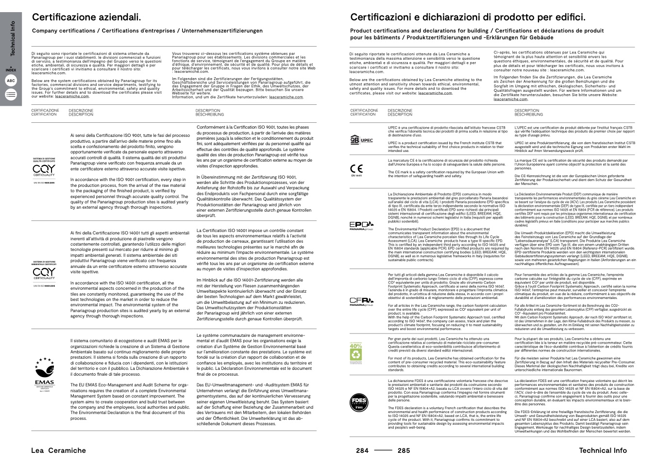 Ci-après, les certifications obtenues par Lea Ceramiche qu