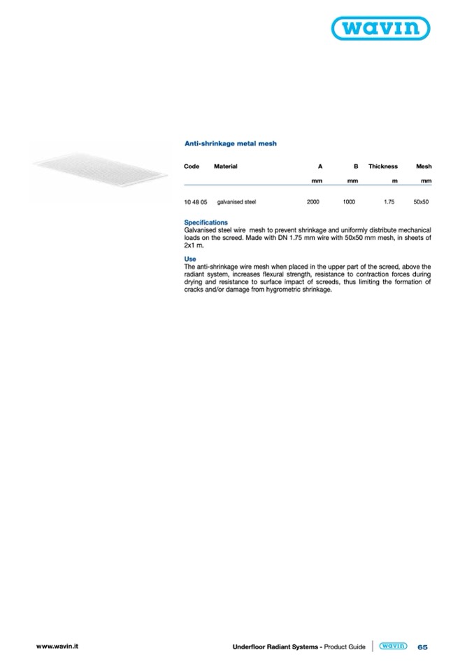 loads on the screed. Made with DN 1.75 mm wire with 50x50 mm mesh, in sheets of
