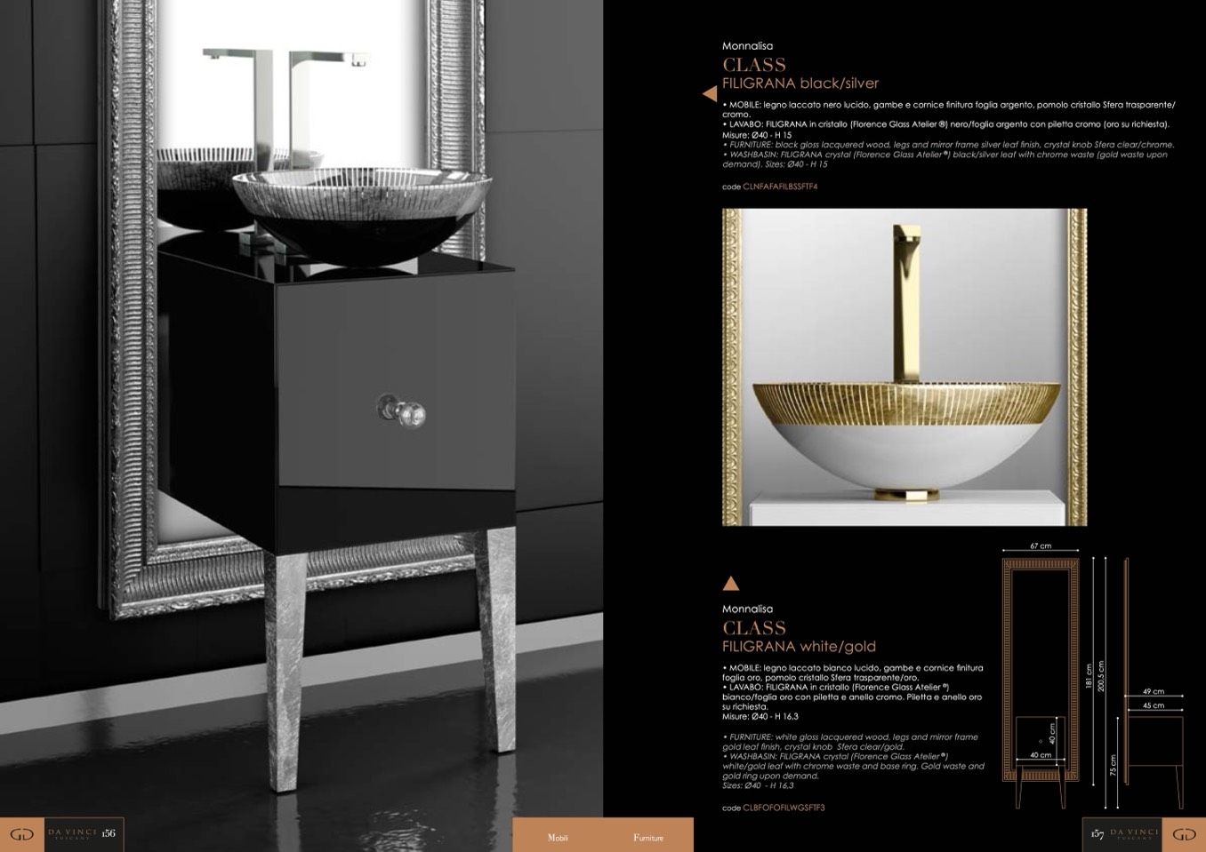 • LAVABO: FILIGRANA in cristallo (Florence Glass Atelier ®) nero/foglia argento con piletta cromo (oro su richiesta).