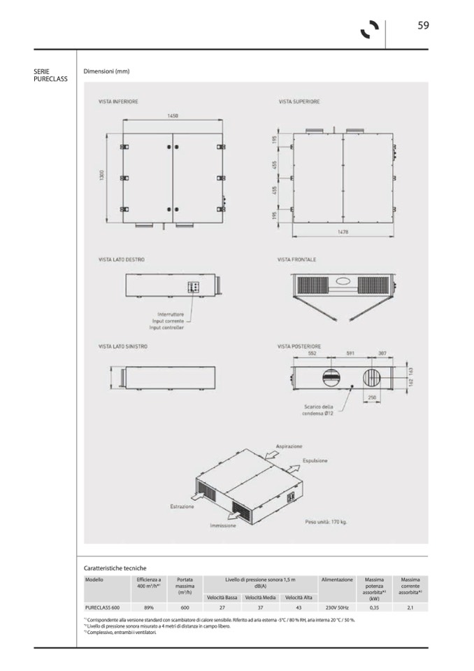Corrispondente alla versione standard con scambiatore di calore sensibile. Riferito ad aria esterna -5°C / 80 % RH, aria interna 20 °C / 50 %.