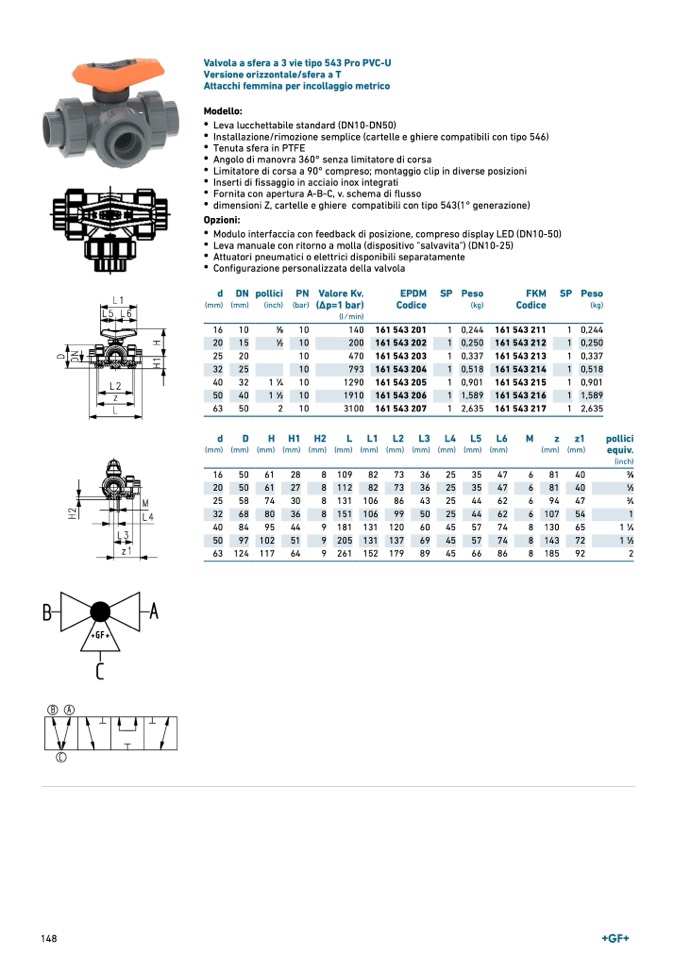 Valvola a sfera a 3 vie tipo 543 Pro PVC-