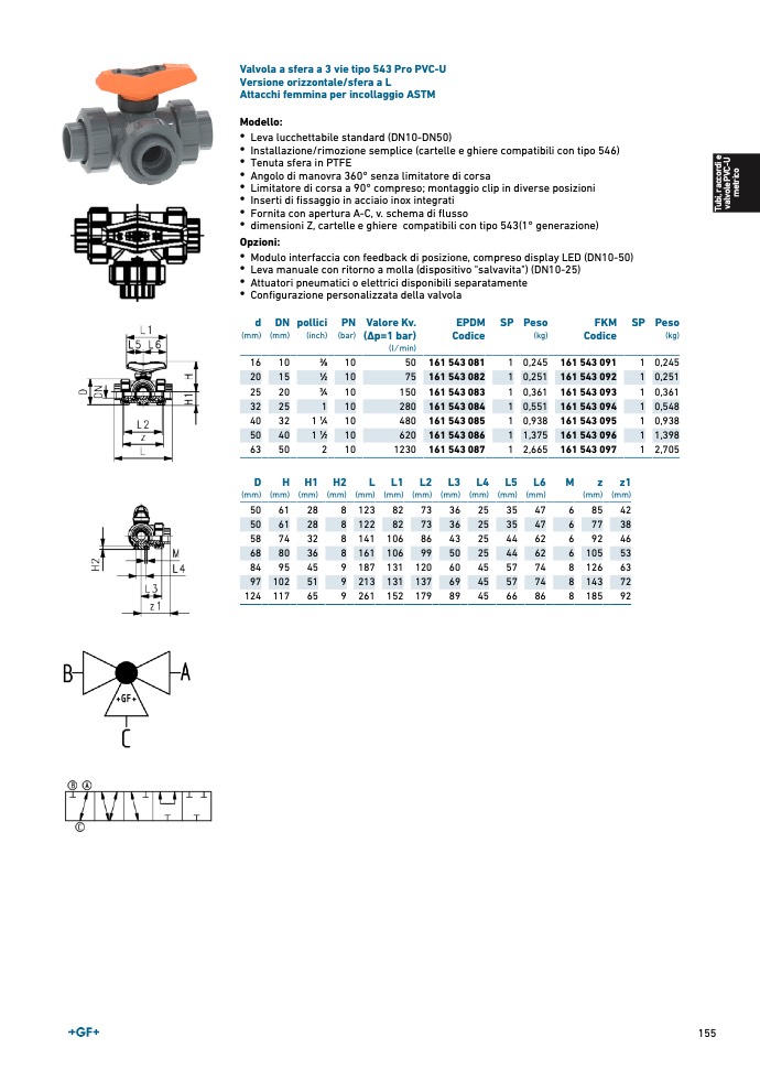 Valvola a sfera a 3 vie tipo 543 Pro PVC-