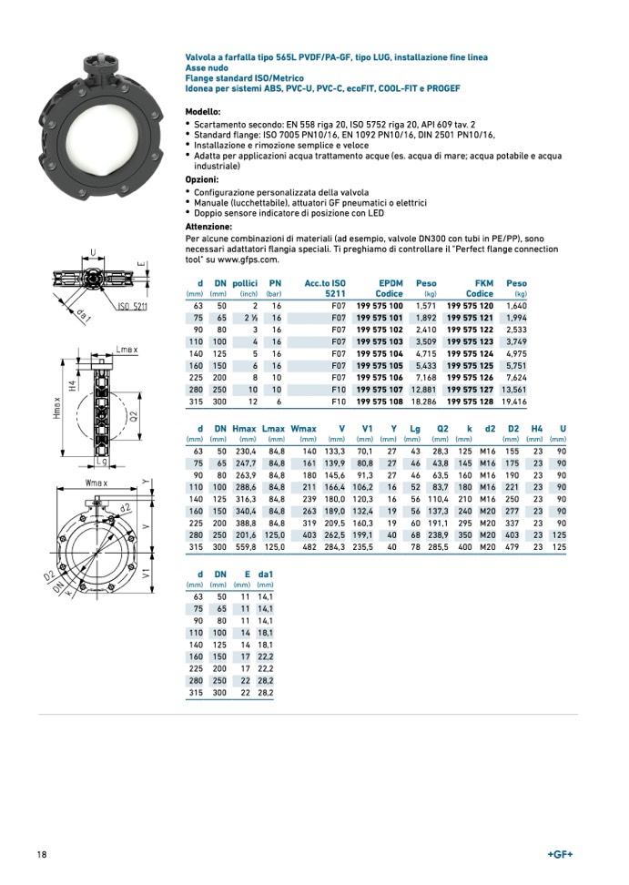 Valvola a farfalla tipo 565L PVDF/PA-GF, tipo LUG, installazione fine linea