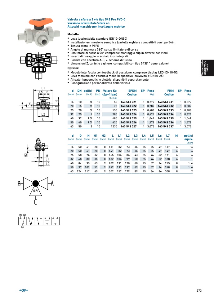 Valvola a sfera a 3 vie tipo 543 Pro PVC-