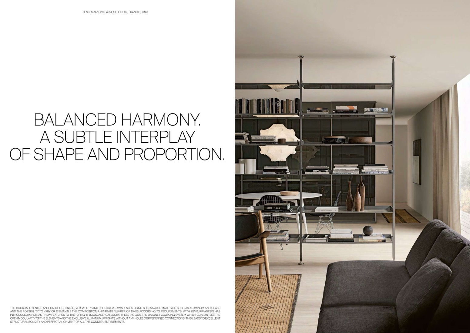 THE BOOKCASE ZENIT IS AN ICON OF LIGHTNESS, VERSATILITY AND ECOLOGICAL AWARENESS USING SUSTAINABLE MATERIALS SUCH AS ALUMINUM AND GLASS