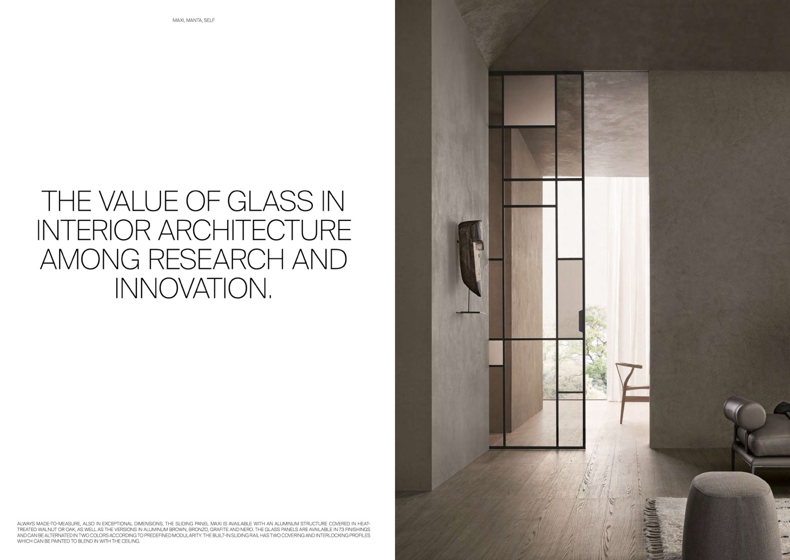 TREATED WALNUT OR OAK, AS WELL AS THE VERSIONS IN ALUMINUM BROWN, BRONZO, GRAFITE AND NERO. THE GLASS PANELS ARE AVAILABLE IN 73 FINISHINGS