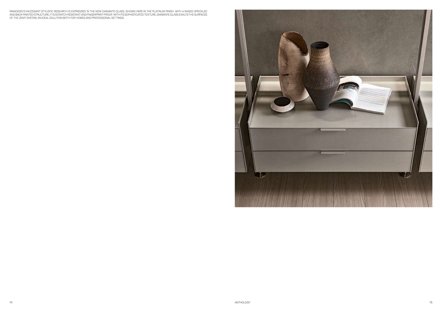 AND BACK-PAINTED STRUCTURE, IT IS SCRATCH RESISTANT AND FINGERPRINT-PROOF. WITH ITS SOPHISTICATED TEXTURE, DIAMANTE GLASS EXALTS THE SURFACES
