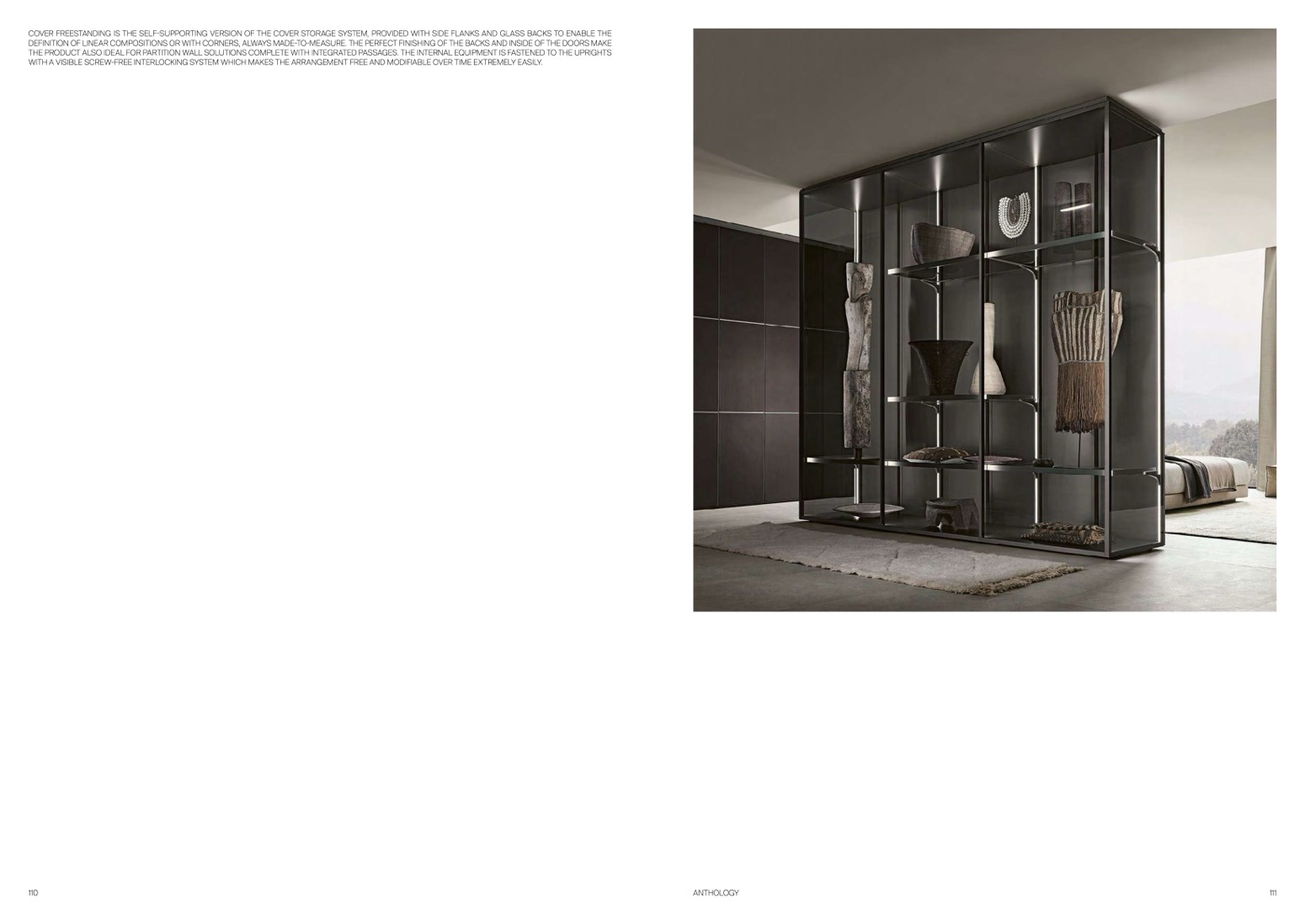 COVER FREESTANDING IS THE SELF-SUPPORTING VERSION OF THE COVER STORAGE SYSTEM, PROVIDED WITH SIDE FLANKS AND GLASS BACKS TO ENABLE THE