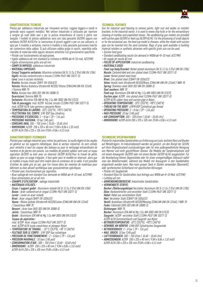 levigate. I modelli di pistola sabbiatrice sono con tubo pescante (A/209) oppure con