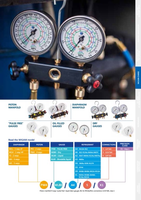 Piston manifold 4-ways “pulse free”, liquid diam gauges. 80, for R410a/R32, connections 5/16”SAE, class 1