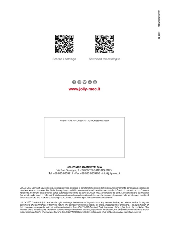 JOLLY MEC Caminetti SpA si riserva, senza preavviso, di variare le caratteristiche dei prodotti in qualunque momento per qualsiasi esigenza di