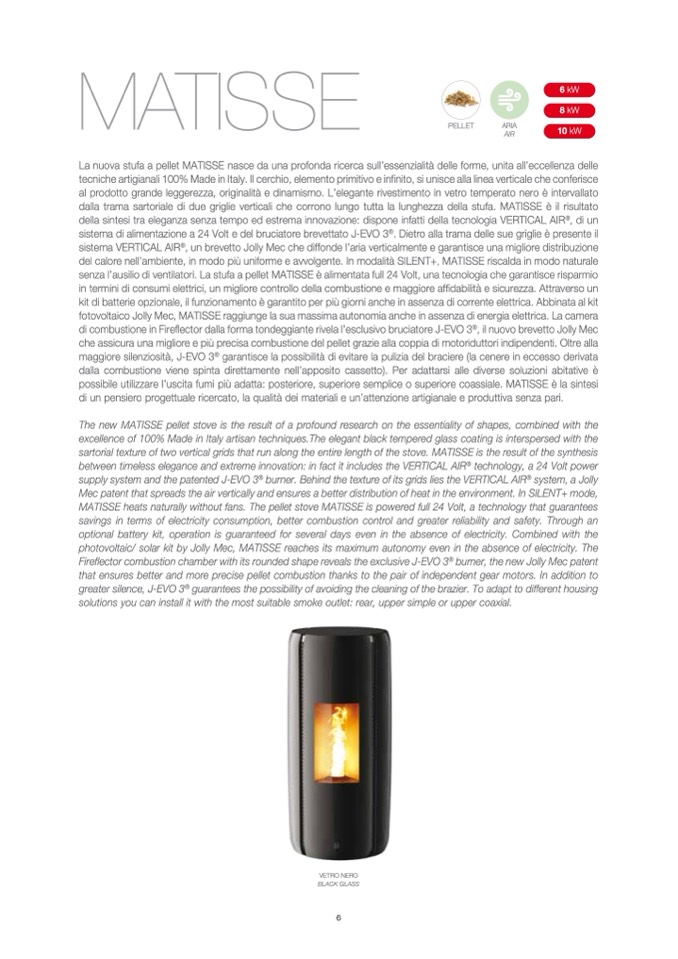 senza l’ausilio di ventilatori. La stufa a pellet MATISSE è alimentata full 24 Volt, una tecnologia che garantisce risparmio