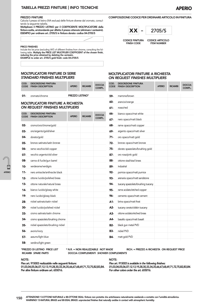 WARNING! 13-NATURAL BRASS and 88-SISAL BRASS: unprotected finishes that naturally oxidise in contact with atmospheric humidity.