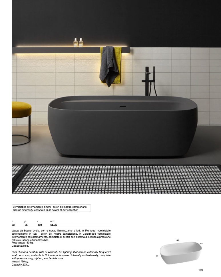 Vasca da bagno ovale, con o senza illuminazione a led, in Flumood, verniciabile