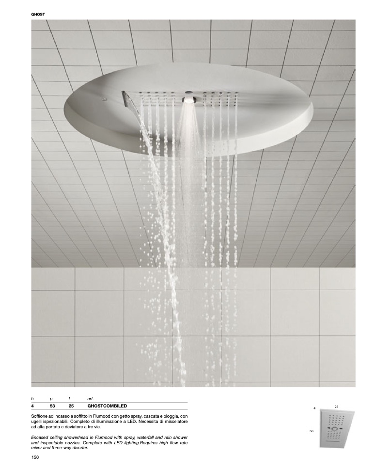 Encased ceiling showerhead in Flumood with spray, waterfall and rain shower
