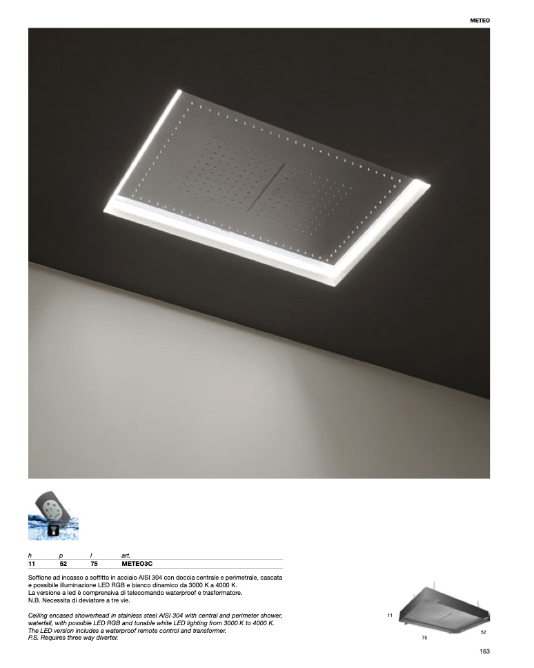 Soffione ad incasso a soffitto in acciaio AISI 304 con doccia centrale e perimetrale, cascata