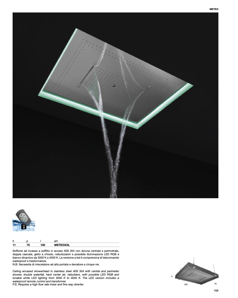 Soffione ad incasso a soffitto in acciaio AISI 304 con doccia centrale e perimetrale,