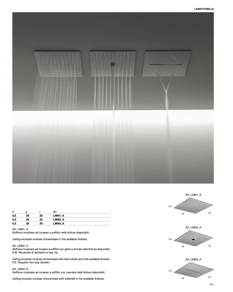 Soffione modulare ad incasso a soffitto con cascata nelle finiture disponibili.