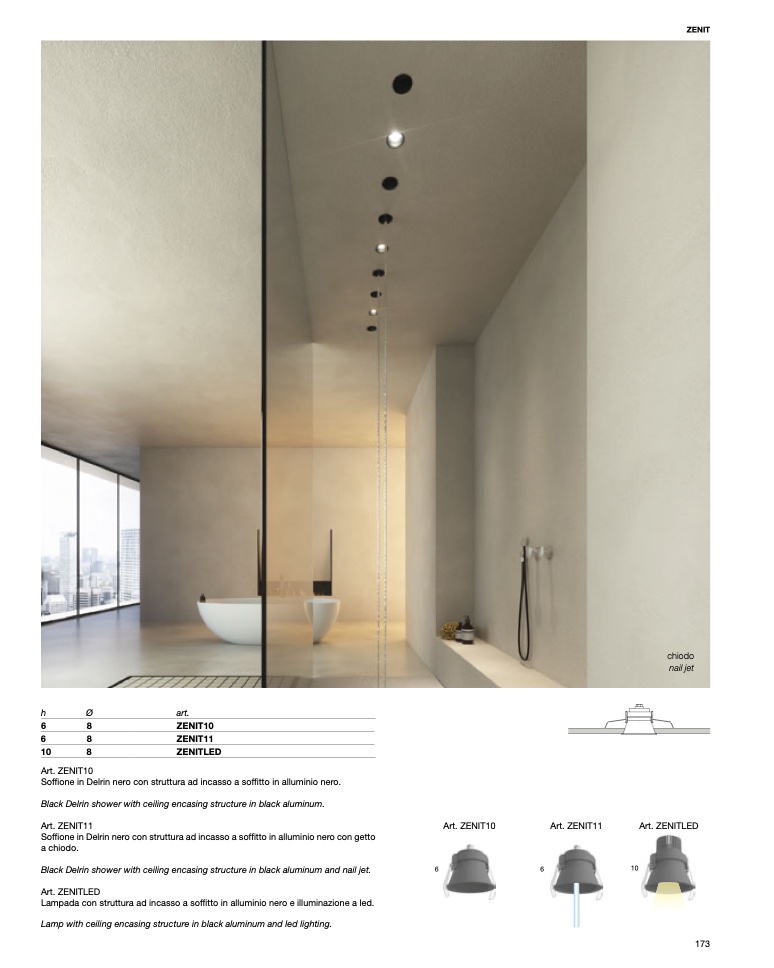 Soffione in Delrin nero con struttura ad incasso a soffitto in alluminio nero.