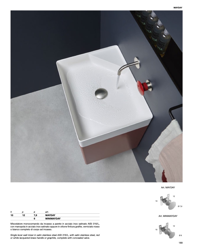 con manopola in acciaio inox satinato oppure in ottone finitura grafite, verniciato rosso